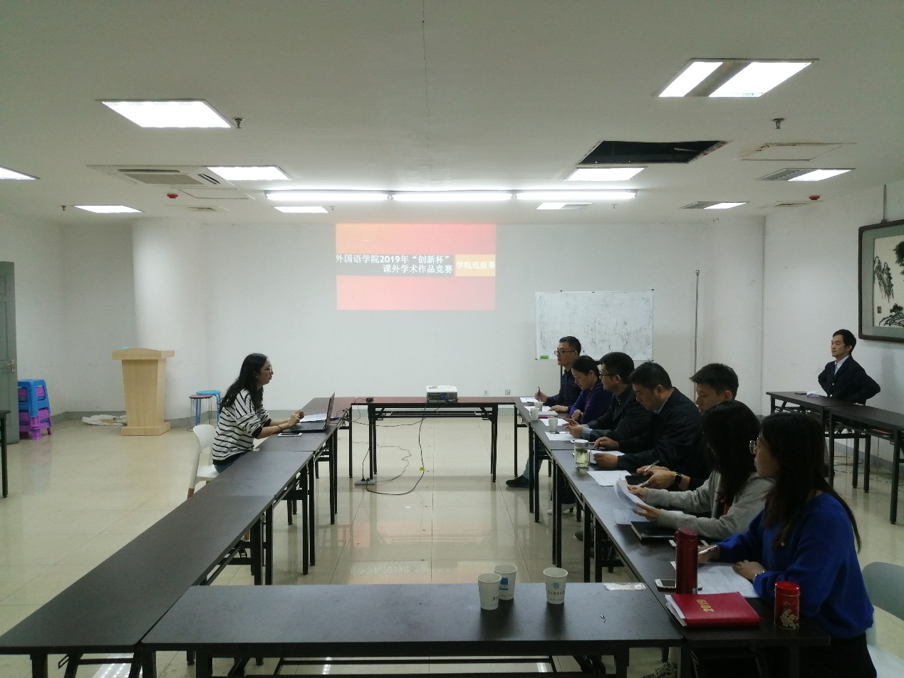 为选拔优秀的作品参加学校第二十一届“创新杯”课外学术科技作品竞赛,10月24日上午,ylzzcom永利总站在圆楼521会议室举行2019年“创新杯”课外学术作品竞赛学院选拔赛。ylzzcom永利总站党委书记陈晓波、副院长臧庆、党委副书记徐欣娅、翻译系主任陶李春、分团委书记王新涛、辅导员高艳丽、蒋丽婷、谭鑫8位老师作为本次选拔赛的评委,听取了参赛作品负责人的成果汇报,并与团队成员作了深入指导交流。