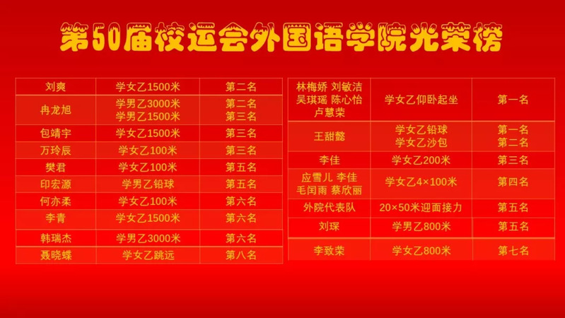 连续两日在赛场上挥洒汗水,外院的运动健儿们为我们争得了“体育道德风尚奖运动队”、“本科乙组女子团体总分第二名”、“本科乙组男女团体总分第五名”三项荣誉称号及累计14块运动会奖牌!