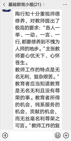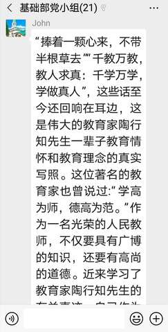 为加强师德师风建设,传承优秀师德师风文化,牢固树立良好的师德师风,ylzzcom永利总站教工大外支部于5月9日开展线上主题党日活动,学习、弘扬陶行知先生教育思想。大家学习了《教育研究》上刊发的文章《好师德、好老师、好教育、好世界》以及教育部等七部门联合印发的《关于加强和改进新时代师德师风建设的意见》,并观看了话剧《行知先生》片段。“行是知之始,知是行之成。”陶行知是当代伟大的人民教育家、教育思想家、卓越的民主主义战士、伟大的爱国者。纵观陶行知的一生,他心中的大事就是通过教育振兴中华民族。陶行知的一生与南京有着千丝万缕的联系,他创办了晓庄师范学校,为南京的教育工作做出了卓越的贡献。