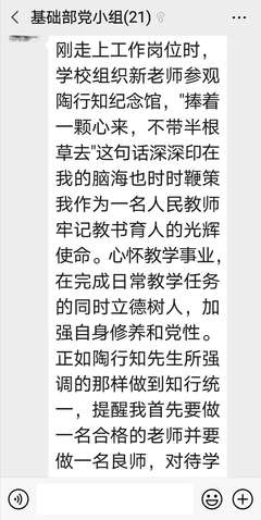党员教师们观看过《行知先生》后,均认为他“捧着一颗心来,不带半根草去”的职业情操既是先生对于教师的殷切希望,也是教育工作者们应当具备的教育品德,彰显了他爱满天下,为国为民的崇高精神。大家认为作为一名教育工作者应当不断更新教育理念、潜心研究。“学高为师,德高为范”,我们要不计名利、无私奉献、尽职尽责、严于律己、以身作则,以自身之言行给学生以楷模之影响。陶行知先生还曾说过:千教万教,教人求真;千学万学,学做真人。这句话也深深的触动着每一位党员教师,大家认为教师应当要怀揣一颗对教育、对学生真挚的心,不断求真务实,因材施教,关心爱护每一位学生的学习、生活以及精神世界。我们教师应当把立德树人作为我们教育的根本任务,引导学生树立正确的世界观、人生观和价值观。