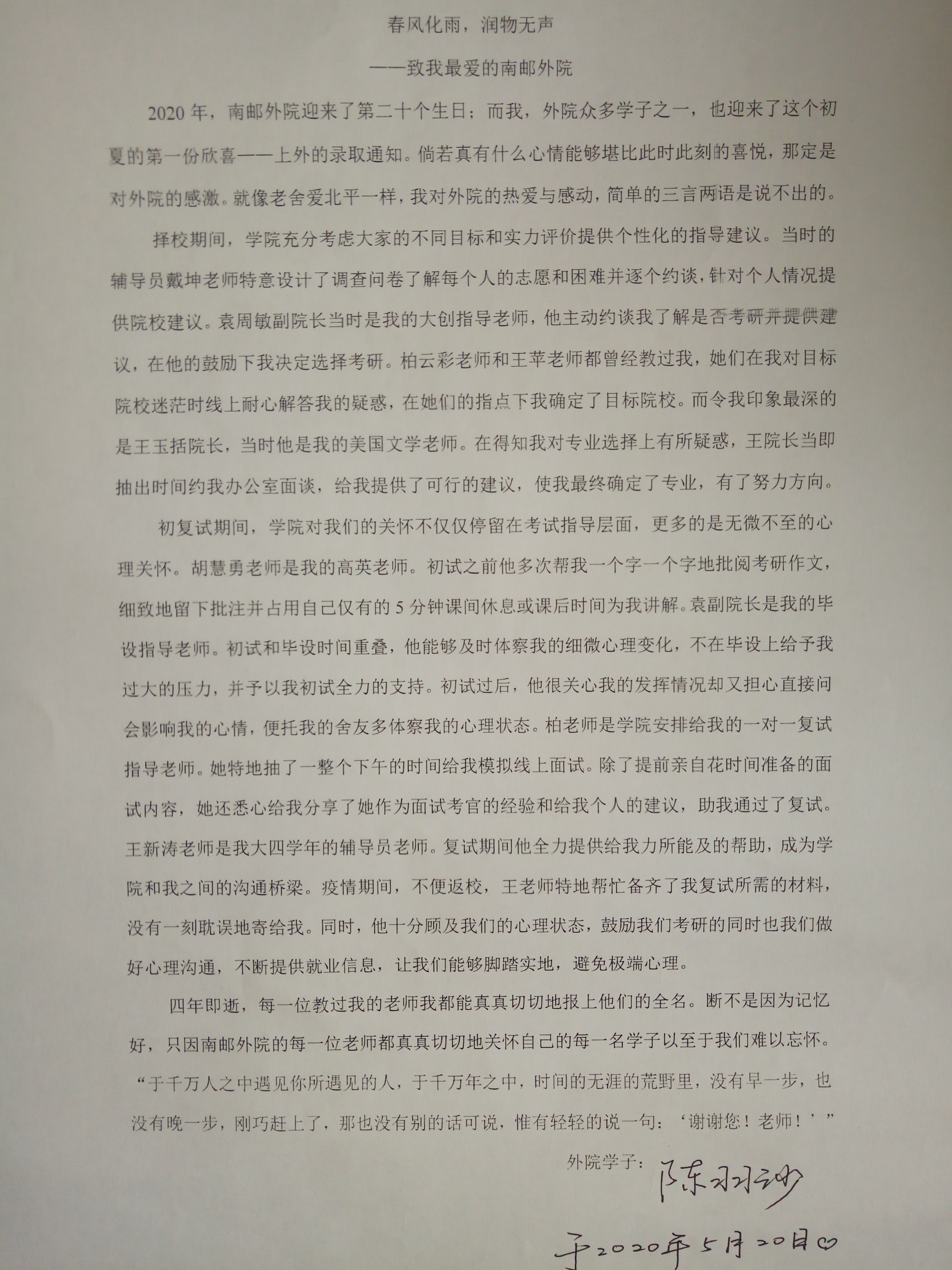 考研的路并不平坦,在这条漫长且枯燥的路上,引路人尤为重要。“辅导员戴坤老师特意设计了调查问卷了解每个人的志愿和困难并逐个约谈”、“在袁周敏副院长的鼓励下决定考研”、“在柏云彩老师和王苹老师的指点下我确定了目标院校”、“在王玉括院长的建议下最终确定了方向”、“胡慧勇老师帮我逐字批阅考研作文”、“王新涛老师为我搭建与学院沟通的桥梁”……陈羽沙在感谢信中一一列举出老师们对自己的恩惠,详细的罗列与细腻的笔触无不透露出对恩师们的感谢。