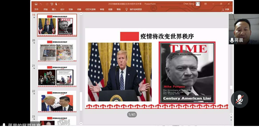 本次讲座的主题是“漫谈国际交流中的外交外事”,分为四部分:秉持人类命运共同体理念,积极开展抗疫国际合作;中国特色大国外交;疫情使世界回不到过去;疫情将改变世界秩序。蒋晨副调研员详细讲述了习近平主席在第73届世界卫生大会视频会议开幕式上发表的题为《团结合作战胜疫情 共同构建人类卫生健康共同体》的致辞、疫情下的“云外交”以及中美关系。同学们紧跟蒋晨副调研员的思路,积极互动,受益匪浅。
