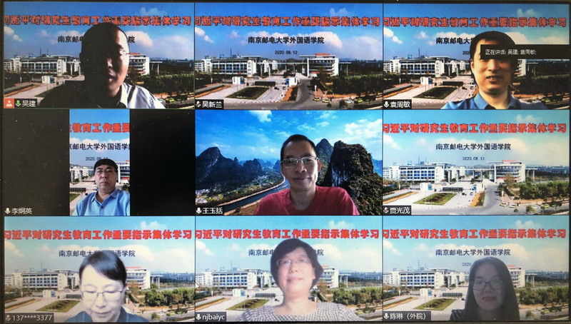 为深入学习、贯彻习近平总书记对研究生教育工作的重要指示精神,外国语学院于8月12日上午召开了线上学习座谈会。袁周敏院长及学院全体研究生导师在线参加了座谈会。会议由吴建副院长在线主持。