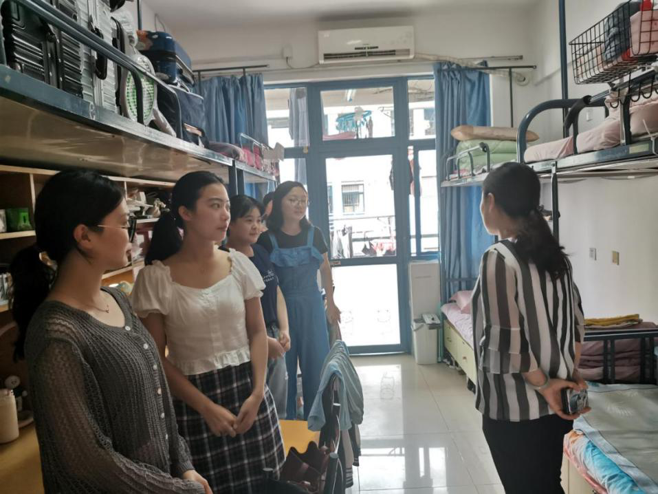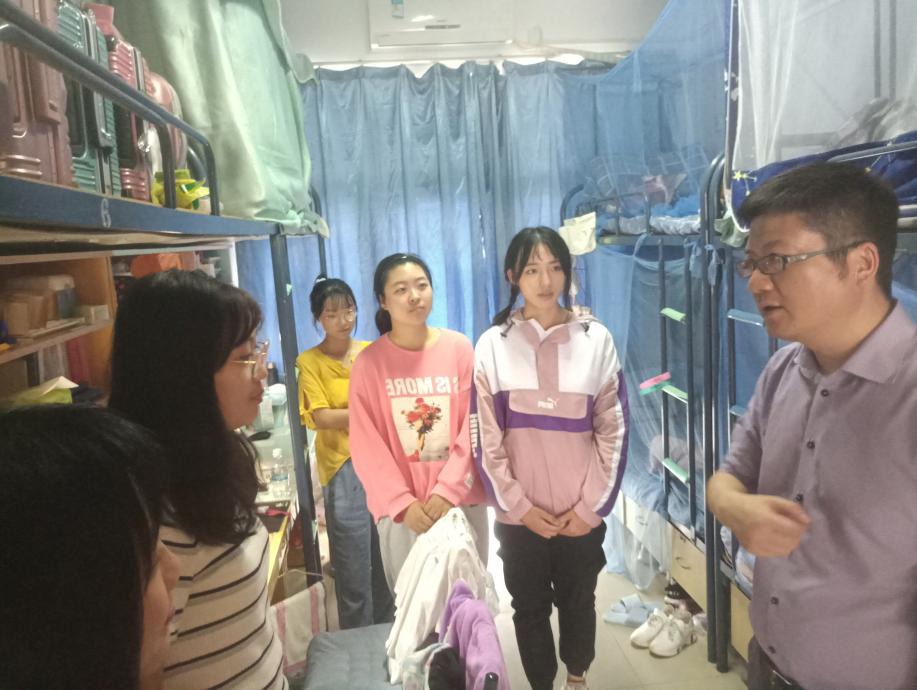 在2020级新生寝室,老师们与新同学们亲切交流:“食堂吃得习惯吗?”“家远不远,国庆回不回家?”在轻松的交谈氛围中,同学们敞开心扉,也体会到了学院的关怀与温暖。遇到正在学习的学生时,老师们提出了勉励,寄语同学们要好好珍惜时间,争取学有所成。同时也叮嘱所有在寝同学要注重安全防范和宿舍氛围建设,尽快融入大学生活。