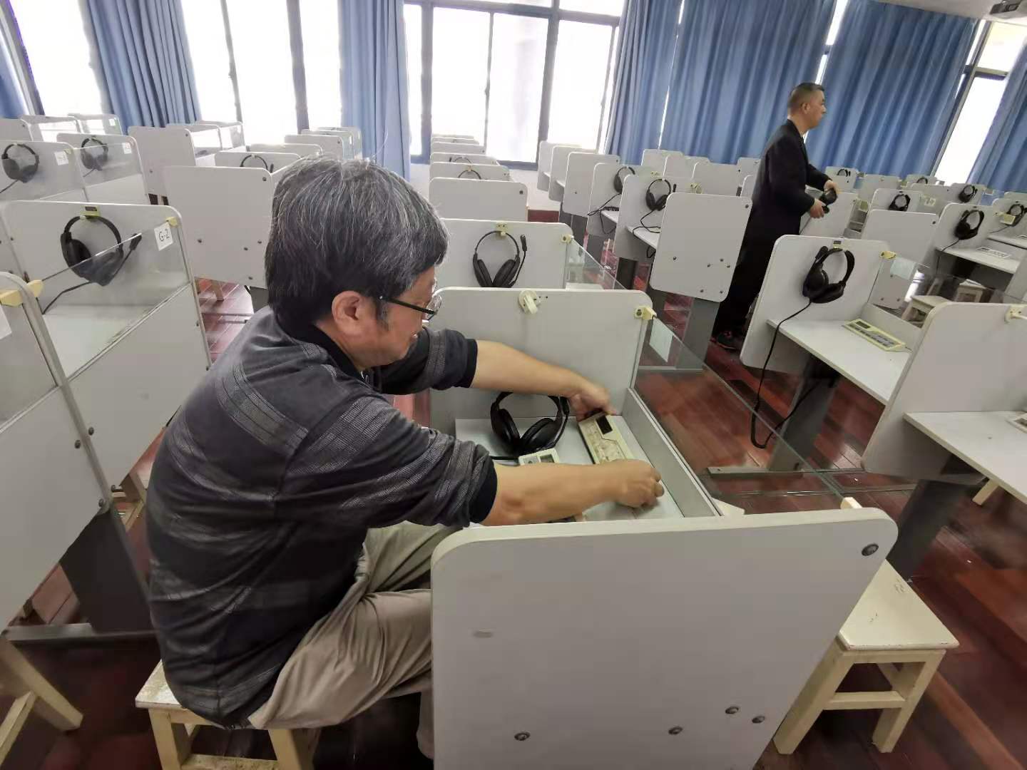 语音设备不同于电脑,耳机插头连接在学生终端上,位置隐蔽,更换过程繁琐。而三间语音室每天课程都是满排,所有检修更换工作只能安排在11:35—13:40之间完成。时间紧,任务重,外语教学实验中心的老师们分工合作,一人负责消杀,其他人逐个检查学生终端,更换故障学生终端,拆卸所有旧耳机,安装并调试新耳机。经过一个中午的忙碌,三间语音室顺利完成设备更换,保证了教学任务的正常进行。等所有教室正常上课后,外语教学实验中心的老师们才开始安心地吃午饭。