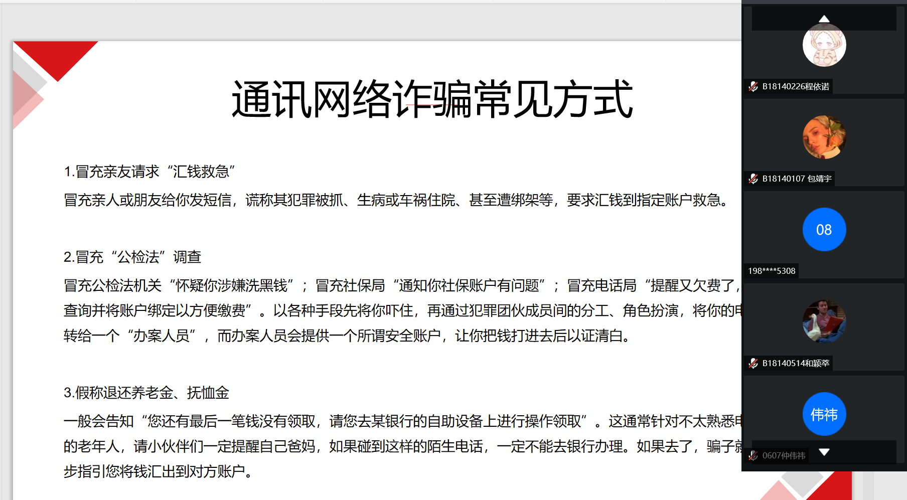 会中,蒋丽婷老师主要解释了通讯网络诈骗的具体含义,着重介绍了网络诈骗的特点和规律,列举了通讯网络诈骗常见方式,通过引入典型的网络、电信诈骗案例,提醒学生不轻信来历不明的电话、不给陌生账户汇款、不透露自己的身份证和银行卡信息、不点击扫描陌生链接与二维码等要求,教育学生要克服“贪利”思想,筑牢自我保护的思想防线。