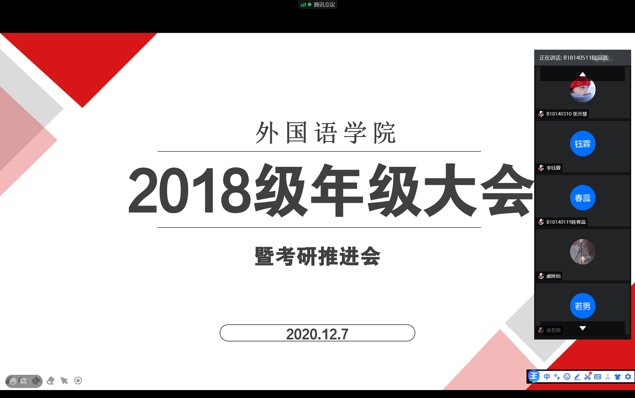 12月7日晚19:00,ylzzcom永利总站2018级学生于腾讯会议线上召开本学期第二次年级大会。会议由辅导员蒋丽婷主持,2018级全体学生参加。