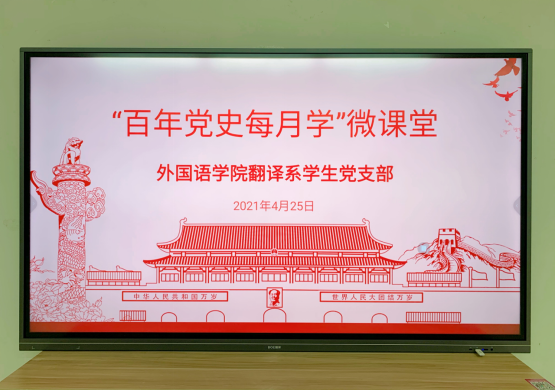 为深入学习贯彻习近平总书记在党史学习教育动员大会上的重要讲话精神,贯彻落实中央、省委、校党委部署要求,动员学生党员“学党史、悟思想、办实事、开新局”,2021年4月25日,翻译系学生党支部在圆楼521开展“百年党史每月学”党史学习教育主题活动。院党委副书记徐欣娅到会指导,党支部书记蒋丽婷主持主题活动,支部全体党员参加。