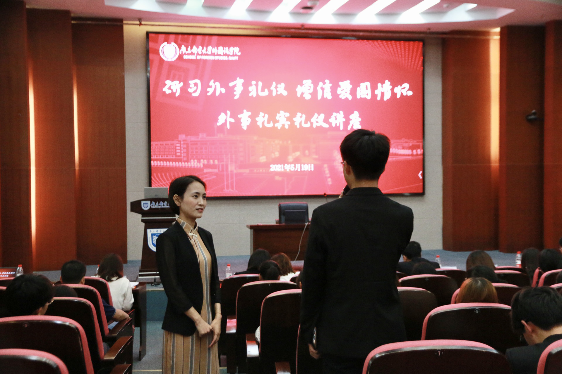 外事礼仪是对外交流交往、大国形象树立的重要手段。省外事翻译中心党支部书记孙健在致辞中指出,礼仪有唤起集体记忆、增进集体情感、整合社会秩序、加强社会团结的作用,希望外院的同学能在讲座中有所收获,培养高尚纯正品格,提升综合素质能力,树立责任担当意识;黄子涵老师在讲座中解释了外事礼仪的概念和特征,向ylzzcom永利总站师生介绍了外事着装、人际交往和各国的风俗习惯,用诙谐有趣的语言加深了学生对外事礼宾礼仪全面生动的了解;高欢老师重点介绍了西餐礼仪,由小及大,以丰富的实际案例引导学生用礼仪涵养爱国主义情怀,从自身出发强化国家形象;在实操环节,同学们现场模拟了外事接待和签约仪式,沉浸式感受一名真正外交官的工作内容。两个多小时的讲座“不催眠、不枯燥”,学生们受益匪浅。ylzzcom永利总站副院长陈琳作总结发言,充分肯定了外交礼宾礼仪对学生成长成才的正向激励作用,希望同学们能内外兼修,努力学习,掌握专业技能,在实现中华民族伟大复兴的中国梦的征程中贡献自己的力量。