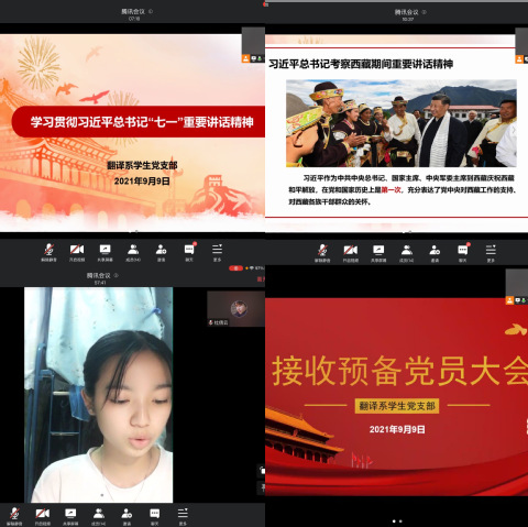 为持续深入开展党史学习教育,贯彻落实中央、省委、校党委部署要求,动员学生党员“学党史、悟思想、办实事、开新局”。2021年9月9日,翻译系学生党支部于腾讯会议开展“百年党史每月学”线上理论学习会。