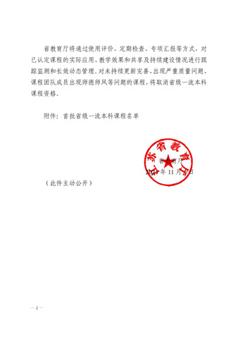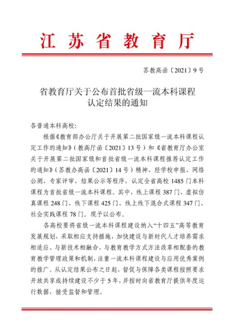 近日,江苏省教育厅公布了首批省级一流本科课程认定结果,ylzzcom永利总站2门课程被认定为省级一流课程,其中线上一流课程1门,线上线下混合式一流课程1门。