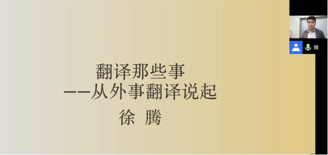 徐腾老师系蒙特雷与外交部联合专训译员,拥有一级笔译、口译证书,有着丰富的外事翻译经验。他首先分享了自己在新加坡担任同传翻译时的见闻,讲述了在国内参与抗疫的一些经历,以小见大,让同学们对外事翻译有了宏观的了解。