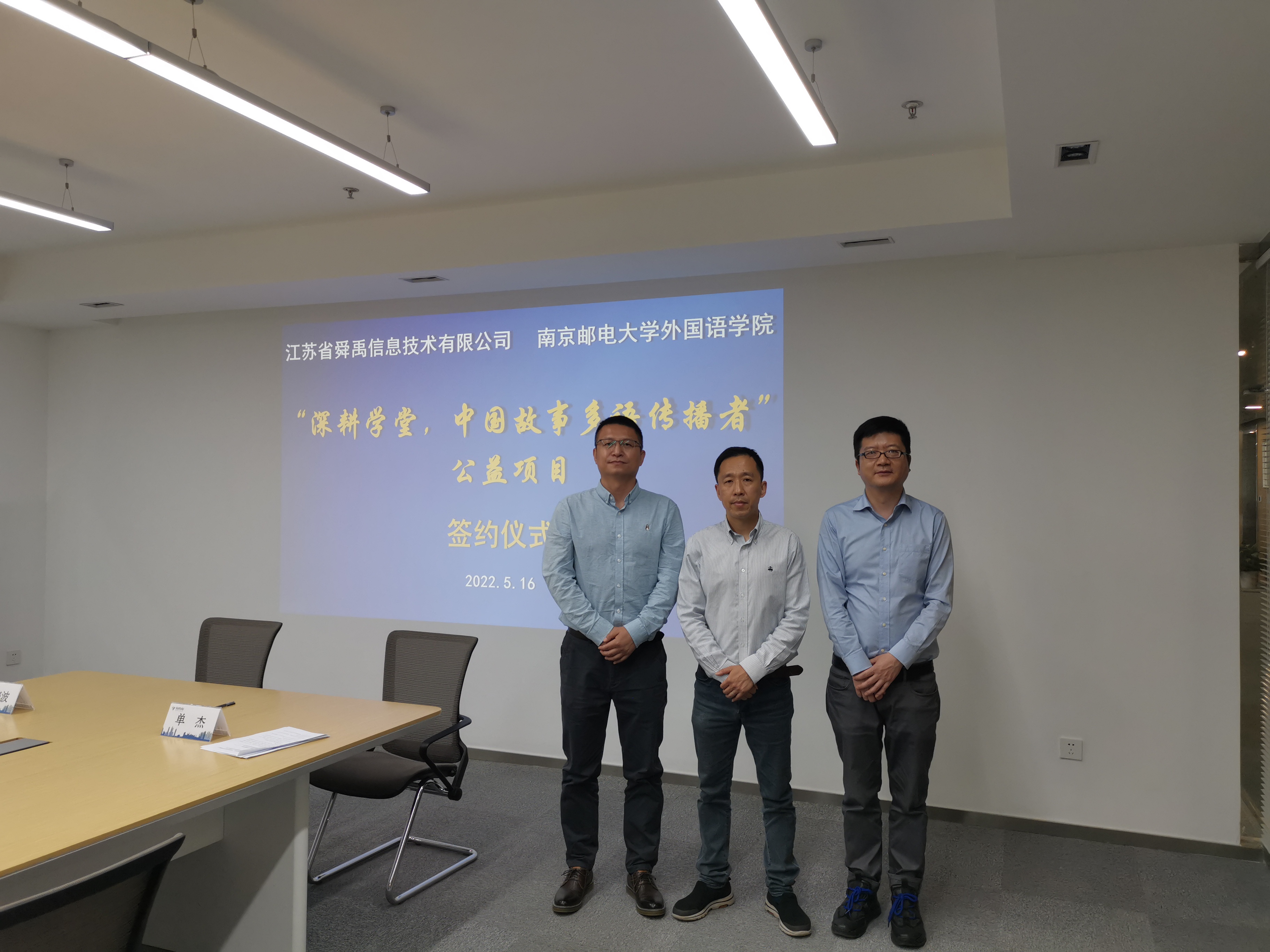 5月16日,“深耕学堂,中国故事多语传播者”公益项目与江苏舜禹信息技术有限公司“国家语言服务出口基地”正式签约。江苏舜禹信息技术有限公司总经理单杰、ylzzcom永利总站教务处副处长臧庆、ylzzcom永利总站党委书记陈晓波、“深耕学堂”公益项目指导教师代表刘宝副教授等出席签约仪式。