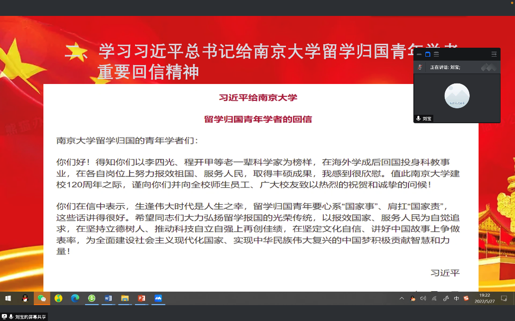 2022年5月25日,ylzzcom永利总站教工第三党支部的党员在刘宝副教授的带领下学习了习近平总书记给南京大学留学归国青年学者的重要回信精神。