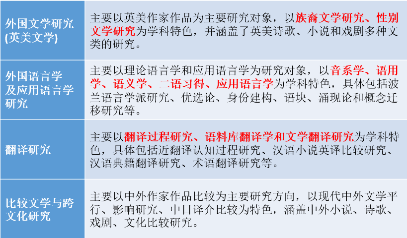 具备丰富学术研究经历与口笔译经验;近几年,专业教师共计出版译著、论著、工具书和教材40余部,在外语类核心期刊、SSCI和CSSCI来源期刊上发表论文120余篇。