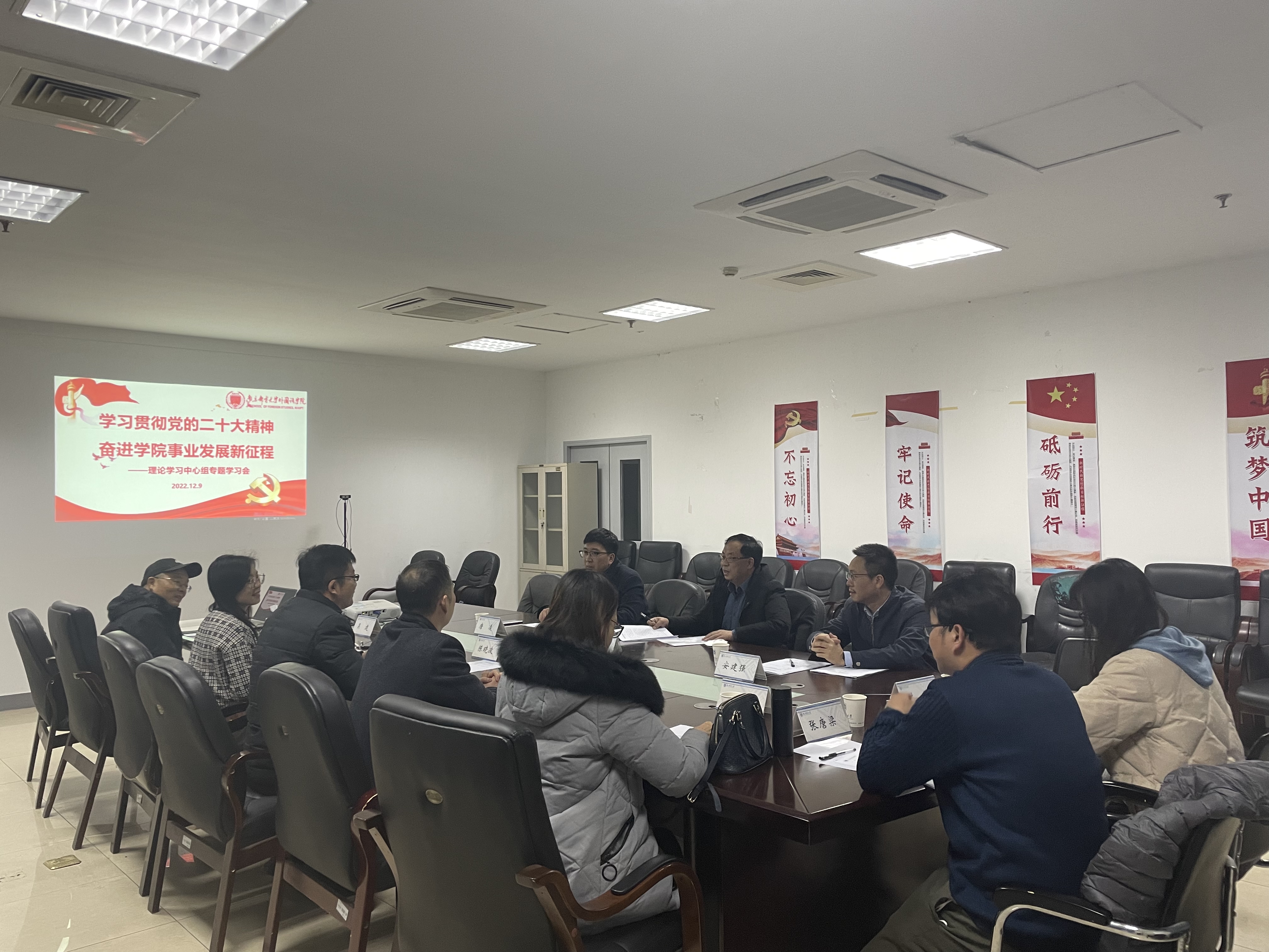 袁周敏院长在重点发言中指出,学院面临发展的关键时期,我们要深入学习研读党的二十大报告原文,全面贯彻落实党的二十大精神,坚持人才是第一资源,坚持人才强院战略,在人才引进、公共外语教学、学科建设、学术团队、专业建设、省级教学成果与教改、实验室建设等方面下足功夫,落实信息文科的一院一大师工作,力争学科建设、专业发展和学术团队建设再上新台阶,全力推进学院“十四五”高质量发展,为学校双一流建设做出新时代的贡献。