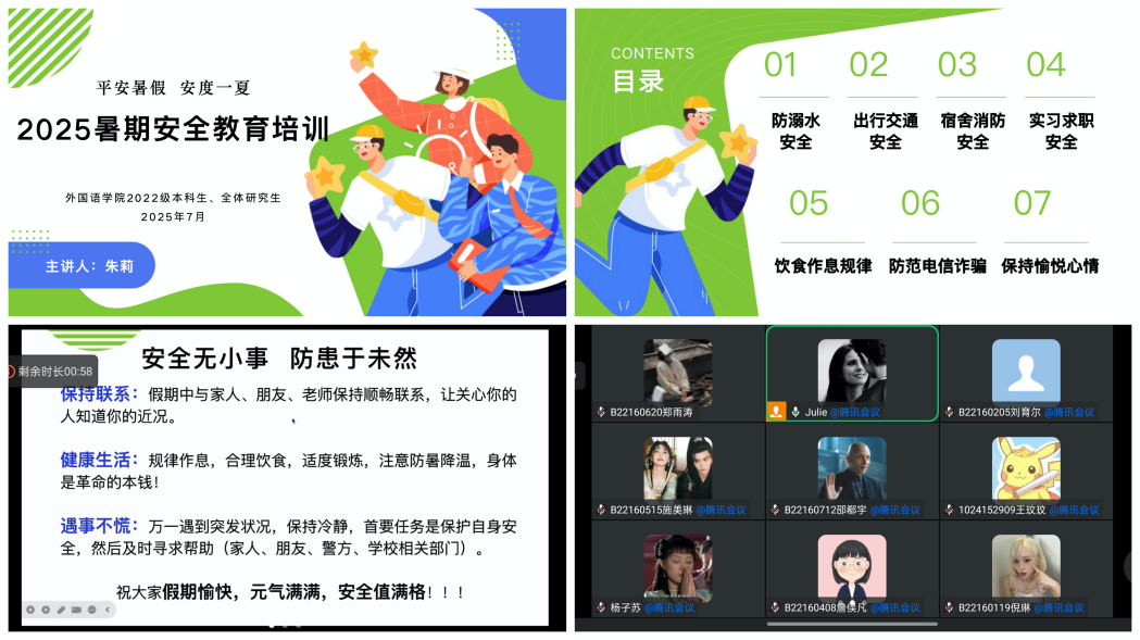 会上,朱莉老师向学生干部强调安全工作的重要性。结合近期高校安全案例,从宿舍消防、电信诈骗、实习实践、交通出行、饮食作息、心理健康等方面强调安全事宜。她要求留校学生严格遵守学校规章制度,做到“进出宿舍要登记、离校返家必报备”,明确每日打卡要求;提醒居家学生注意防火防盗,保护好人身财产安全,出行注意防范极端天气。同时,向同学们公布校园报警、校园急救、宿舍苑区值班电话以及校园心理热线、江苏省大学生心理热线等联系方式以保障信息畅通。会后,各班级开展线上安全教育班会,扎实做好暑期安全工作。