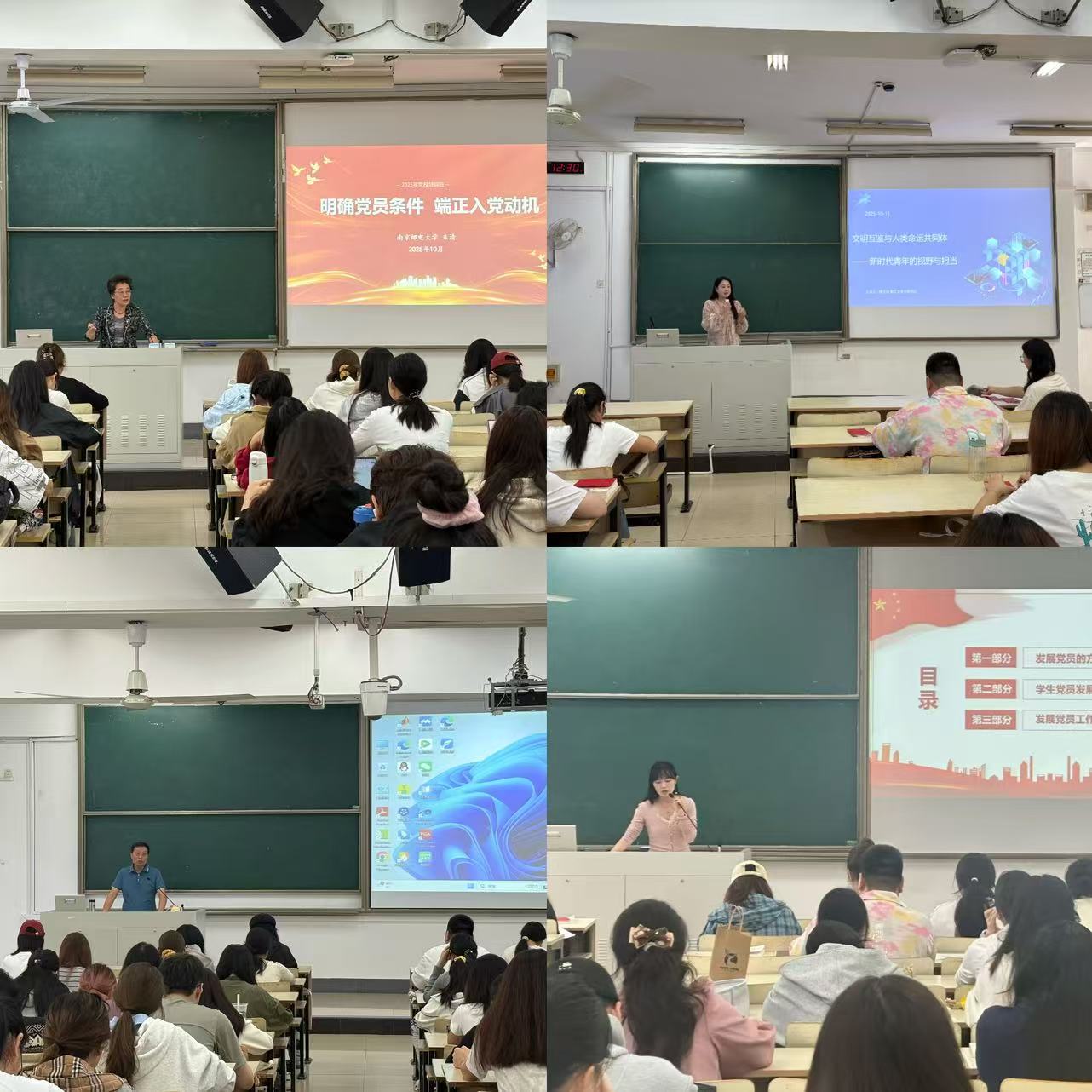 本次培训安排了学院党委书记陈晓波,江苏省优秀党务工作者、校关工委讲师团成员朱清,校关工委副秘书长、学院特邀党建组织员张和明,学院教工大外党支部书记颜文洁,党委组织员史慧慧为入党积极分子讲授《学习贯彻党的二十届三中全会精神,努力成为担当民族复兴重任的时代新人》《明确党员条件,端正入党动机》《铭记光辉历程,传承红色基因,担当时代重任》《文明互鉴与人类命运共同体——新时代青年的视野与担当》《发展党员的工作流程和手续》等专题党课。此外,学员们还研读了《中国共产党章程》《党的二十大报告》《入党教材》等,观看了《2025开学第一课》《榜样9》《党课开讲啦》等精品视频课程,积极参与小组讨论并认真撰写学习心得。